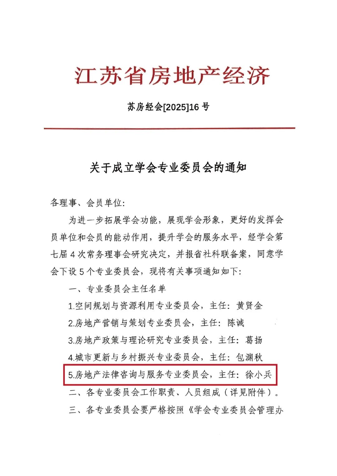 近日,江苏省房地产经济学会发布《关于成立学会专业委员会的通知》(苏房经会 [2025] 16 号),正式聘请江苏百闻律师事务所(以下简称“百闻所”)主任徐小兵担任房地产法律咨询与服务专业委员会主任,该委员会将围绕房地产政策研究、法治宣传、智库服务、争议调解等核心职能开展工作。徐小兵主任的获聘既是对其专业实力与行业影响力的认可,也是对百闻所在房地产法律服务、行业合规发展贡献的认可。